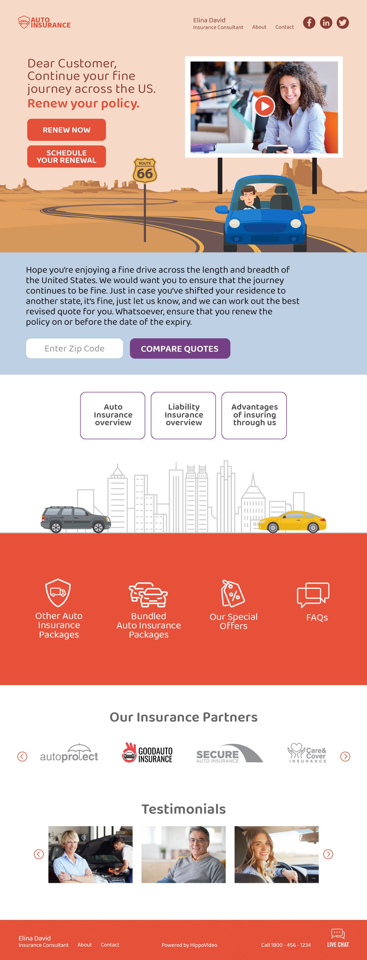 In addition, links to useful resources like the advantages of insuring with your company, coverage details, insurance packages, special offers, and FAQs can also be inserted in the landing page. You can also build trust with your customers through embedded video testimonials of other delighted customers across the page.